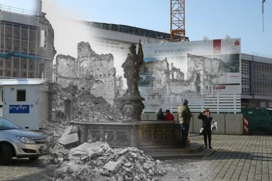 Edificios en ruinas alrededor de la plaza Neumarkt, presidida por una fuente con estatua. En 2015, unos turistas se sacan una foto.