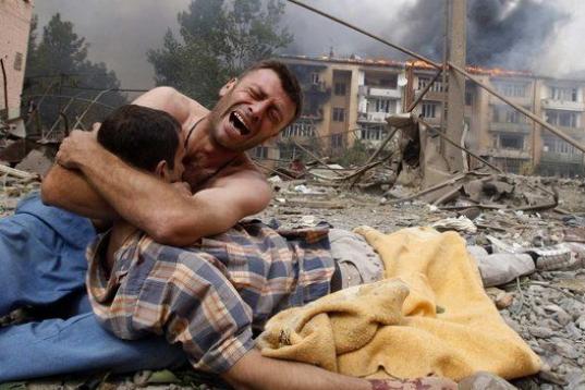 Un hombre llora la muerte de un amigo tras un bombardeo en Gori (Georgia) en agosto de 2008.