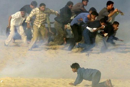 Palestinos huyen de soldados israelíes al sur de Gaza en el año 2000.