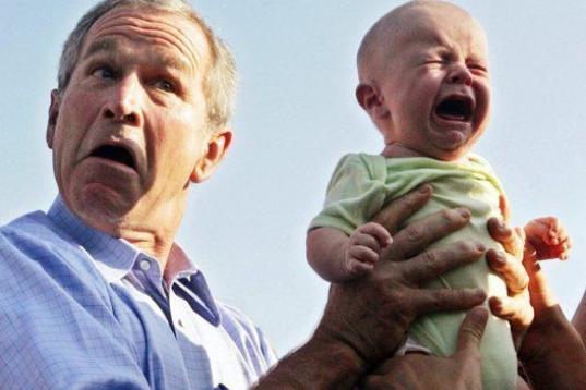 George W. Bush sostiene a un bebé llorando en una visita a Alemania en 2006.