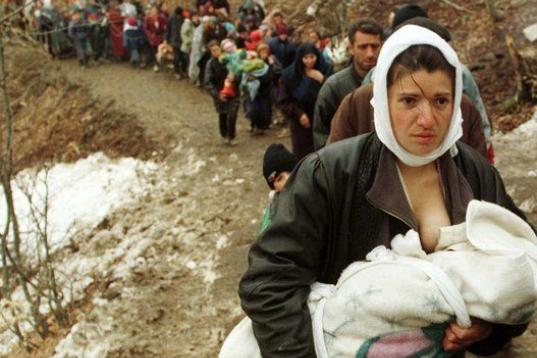 Una mujer albanesa da el pecho a su bebé mientras huye con otros 2.000 refugiados de la guerra de Kosovo en 1999.