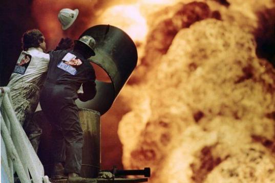Bomberos tratan de apagar un incendio en los pozos de petróleo de Al-Ahmadi provocado por las fuerzas de Saddam Hussein el 30 de marzo 1991.