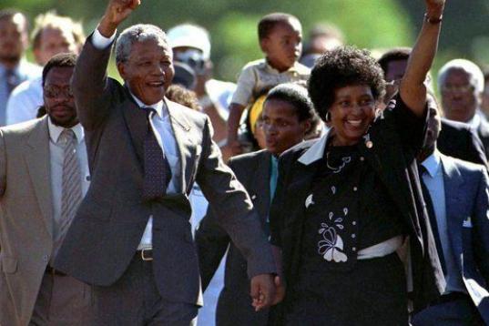 Nelson Mandela sale en libertad junto a su esposa el 11 de febrero de 1990.