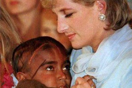 La Princesa de Gales abraza a un niño enfermo de cáncer en Lahore en febrero de 1997.