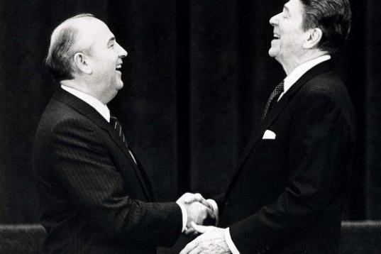 Ronald Reagan y Mikhail Gorbachev se dan la mano en noviembre de 1985.