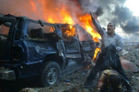 Un hombre pide ayuda tras un atentado en Beirut en febrero de 2005