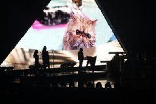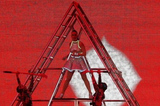 La diva de la última Superbowl también presumió de su gato, de sus videoclips (algunos de ellos se proyectaron en la pantalla triangular situada atrás del todo), de puesta en escena y de locos estilismos. Perry puso en escena un colorido letrero con las nueve letras de la palabra Hollywood, un descapotable, un caballo gigante para cantar Dark Horse mariposas gigantes de tela o cintas de correr; de hecho, los laterales del escenario se movían como tales. Una puesta en escena con las referencias absolutamente pop que recorren la carrera de Katy, tanto en sus canciones como en las alfombras rojas y en su faceta de diseñadora: ella misma diseñó, por ejemplo, los pendientes de balones de rugby que llevó para la presentación de la Superbowl, y tiene una colección de accesorios con anillos de cubos de palomitas o fundas de móvil en forma de tarta en llamada Prism Collection junto a la firma Claire's.