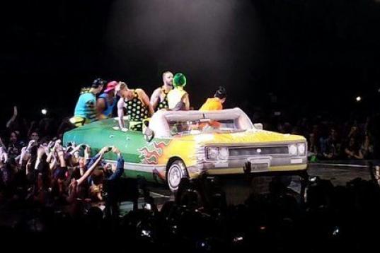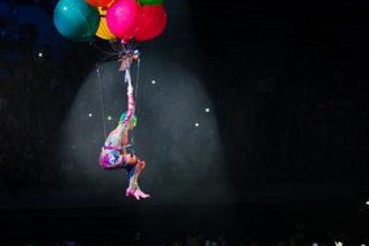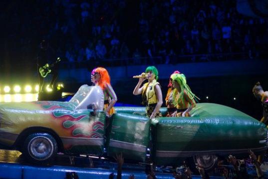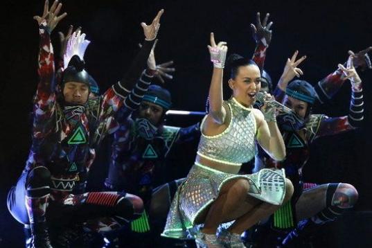 Su ropa también fue protagonista: además de ese primer look con LEDS, se vistió de Cleopatra (desmontable, pues luego lució el mono que llevaba debajo ); de gatita rosa con cola incluida; con un vestido blanco y una gran capa de hada (de Valentino); con mallas, falda de smileys y peluca verde (vestida por Jeremy Scott para Moschino); con un vestido rosa y medias de colores que convirtió en un mono con transparencias; con un sujetador de palmeras, falda a juego y medias altas brillantes; y, por último, para cerrar con Firework, con un mono azul y una falda con polisón.