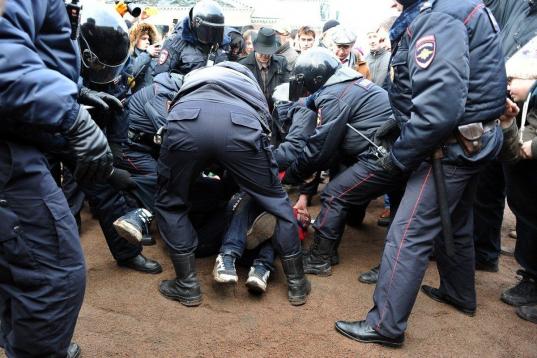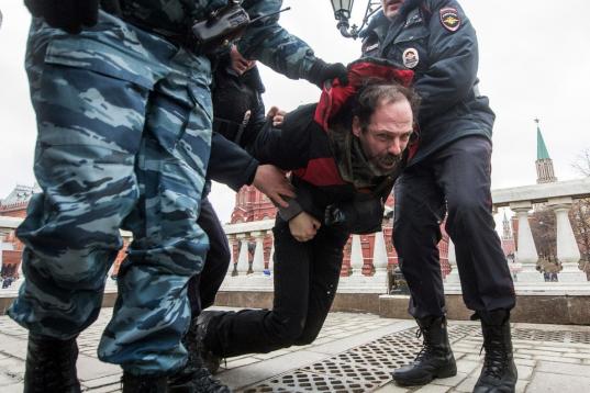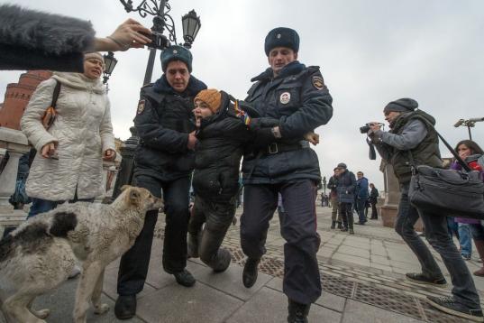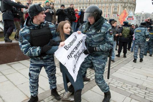 El momento en que un policía arresta a una joven en la Plaza de Manezhnaya, en Moscú, en protesta por una posible acción militar rusa en Crimea. En el cartel que sostiene la chica se lee: "La guerra es criminal, Putin debe ser ejecutado".