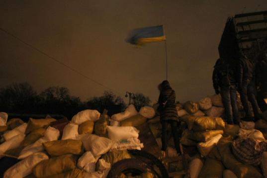 Una niña sostiene una bandera ucraniana en una barricada entre la policía y los manifestantes en Kiev, Ucrania.