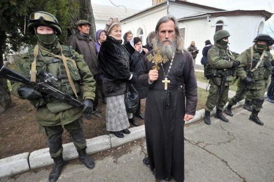 Un sacerdote ortodoxo contrasta con el militar armado.
