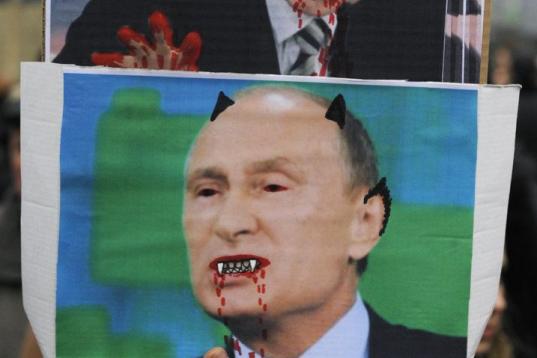 Esta es la imagen que tienen de Vladimir Putin. Un cartel durante una manifestación en Kiev.