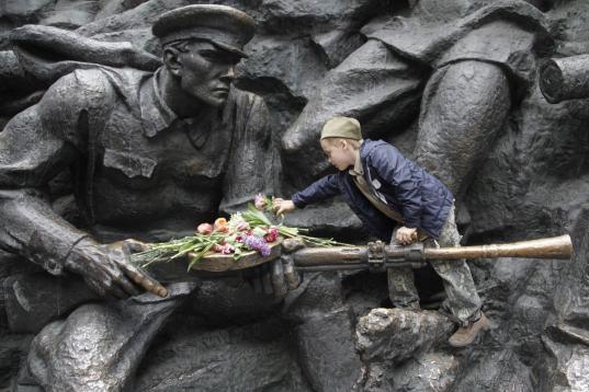 Un niño coloca flores en la Tumba del Soldado Desconocido en Kiev, Ucrania.