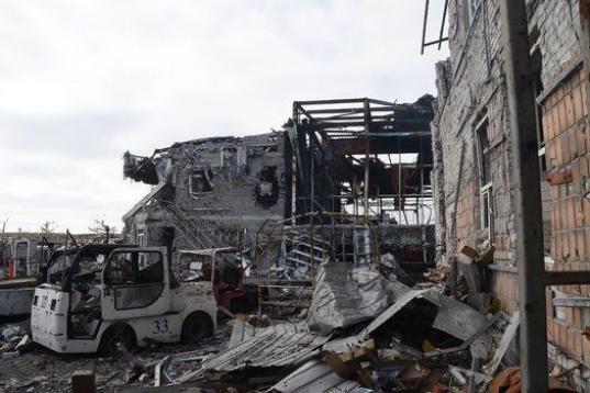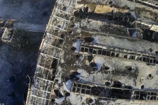 Fotografía tomada el 7 de febrero desde el interior de una terminal del aeropuerto destruida por el bombardeo que aún continúa en el este del país.