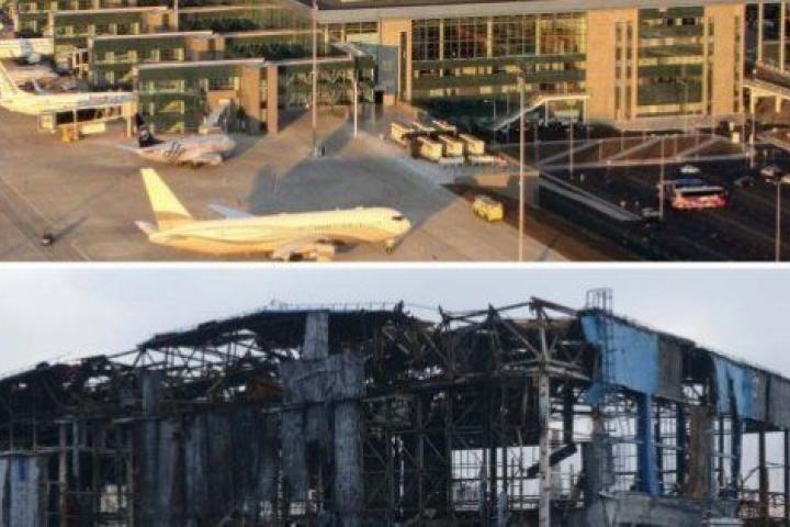 Una foto del antes y después del aeropuerto devastado