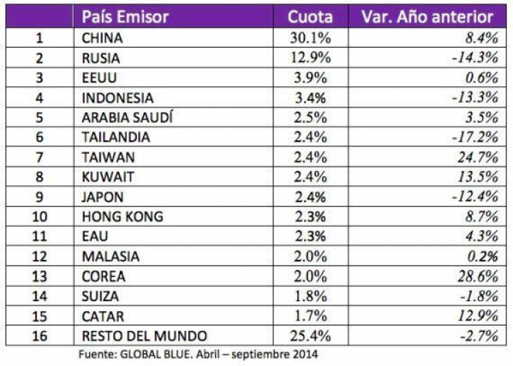 Desde 2012, China es el primer país en volumen de gasto que realizan sus turistas, sacándole la delantera a Rusia. Según la OMT, cada visitante chino que vino a España en 2013 pagó de media 2.040 euros en el paquete turístico y aparte 167 euros diarios para compras —principalmente, ropa—. Un dato revelador sobre el dinero que destinan a ello es el montante de las devoluciones de impuestos (Tax Free). Esta tabla refleja cuáles fueron los mayores compradores internacionales en nuestro país durante dos trimestres de 2014.