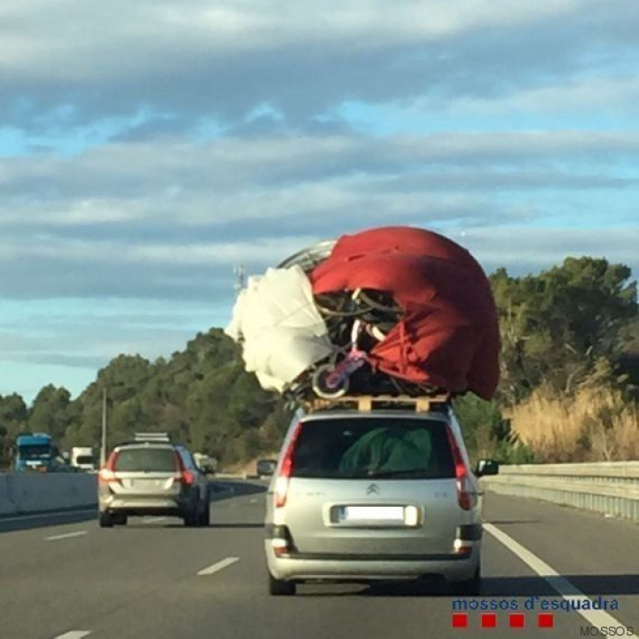 Empezó a llenar la baca (o, más bien, un palé instalado en el techo del coche) y se le acabó yendo de las manos. Los Mossos d'Esquadra han denunciado a un conductor que viajaba por la autopista AP-7 en Salt (Girona) con una enorme carga instalada en el techo del coche y que se excedía en media tonelada a la masa máxima autorizada del vehículo.