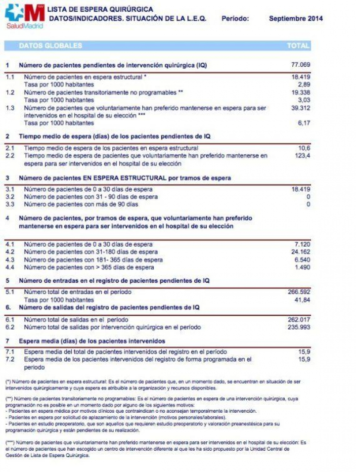 Los propios datos de la Comunidad de Madrid desmienten esa afirmación. Según las últimas cifras publicadas, en septiembre, hay 77.069 personas esperando una operación.