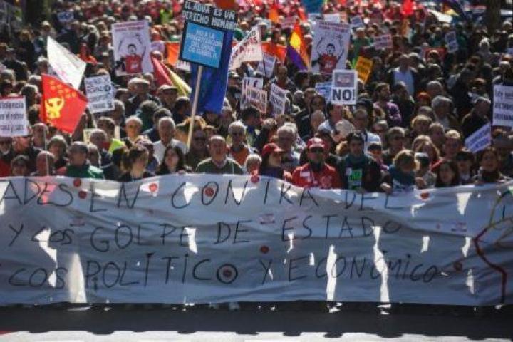 Bajo el lema "Por las Libertades, los derechos y los servicios públicos. Contra el golpe de Estado político y económico", centenares de personas procedentes de las diferentes mareas han recorrido el trayecto comprendido entre la glorieta de Carlos V, en Atocha, hasta la plaza de las Cortes, frente al Congreso de los Diputados, un día antes del aniversario del Golpe de Estado del 23-F.