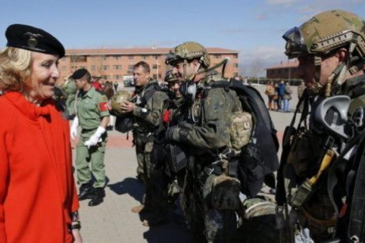 En la base Príncipe, en Paracuellos del Jarama, sede de la Brigada Paracaidista Almogávares VI (BRIPAC), la dirigente popular ha recibido la boina negra y el título que le acreditan como Dama de Honor, de manos del jefe de esta unidad de elite de las Fuerzas Armadas, general Juan Cifuentes.