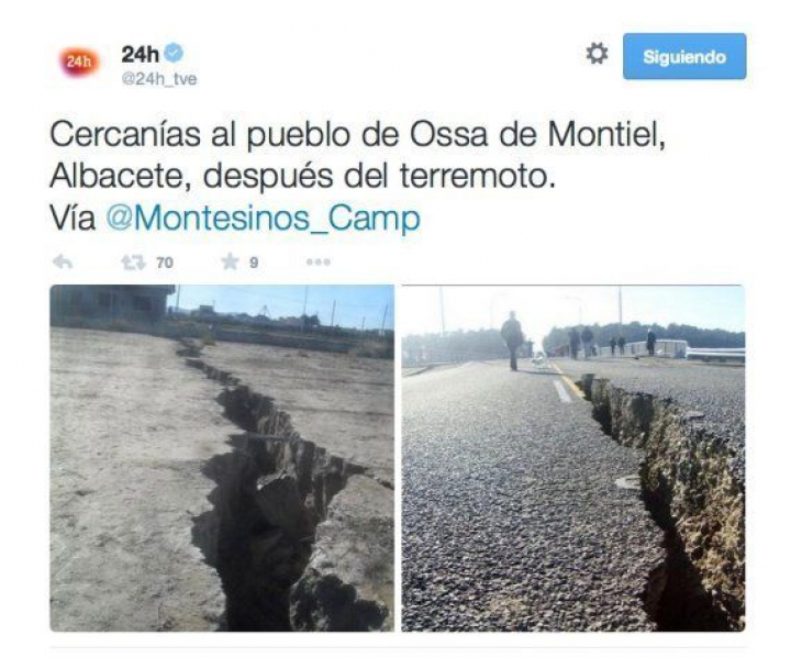 Después del primer momento de sorpresa y risa, algunos se han empezado a preguntar qué ha pasado en el epicentro, Ossa de Montiel, en Albacete, y han empezado a circular fotos sobre unas grietas que presuntamente son resultado del temblor. La premura y las prisas por ser el primero en dar la noticia ha hecho que hasta medios como RTVE las hayan difundido.
