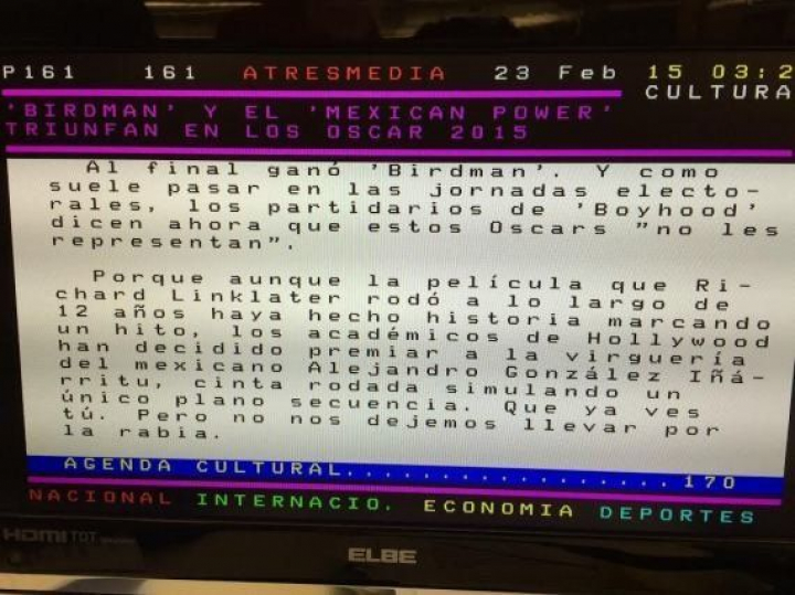 Es el caso de la crónica de la gala de los Oscar que se ha publicado en el Teletexto de Atresmedia (La Sexta y Antena 3), que no ha sido retirada, y que ha provocado revuelo en Twitter. La autora de esa crónica empieza fuerte: "Al final ganó 'Birdman'. Y como suele pasar en las jornadas electorales, los partidarios de 'Boyhood' dicen ahora que estos Oscars 'no les representan".