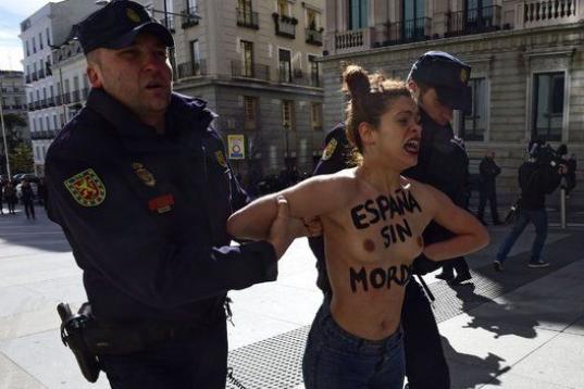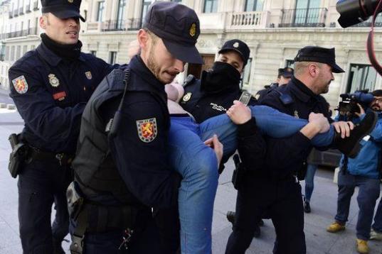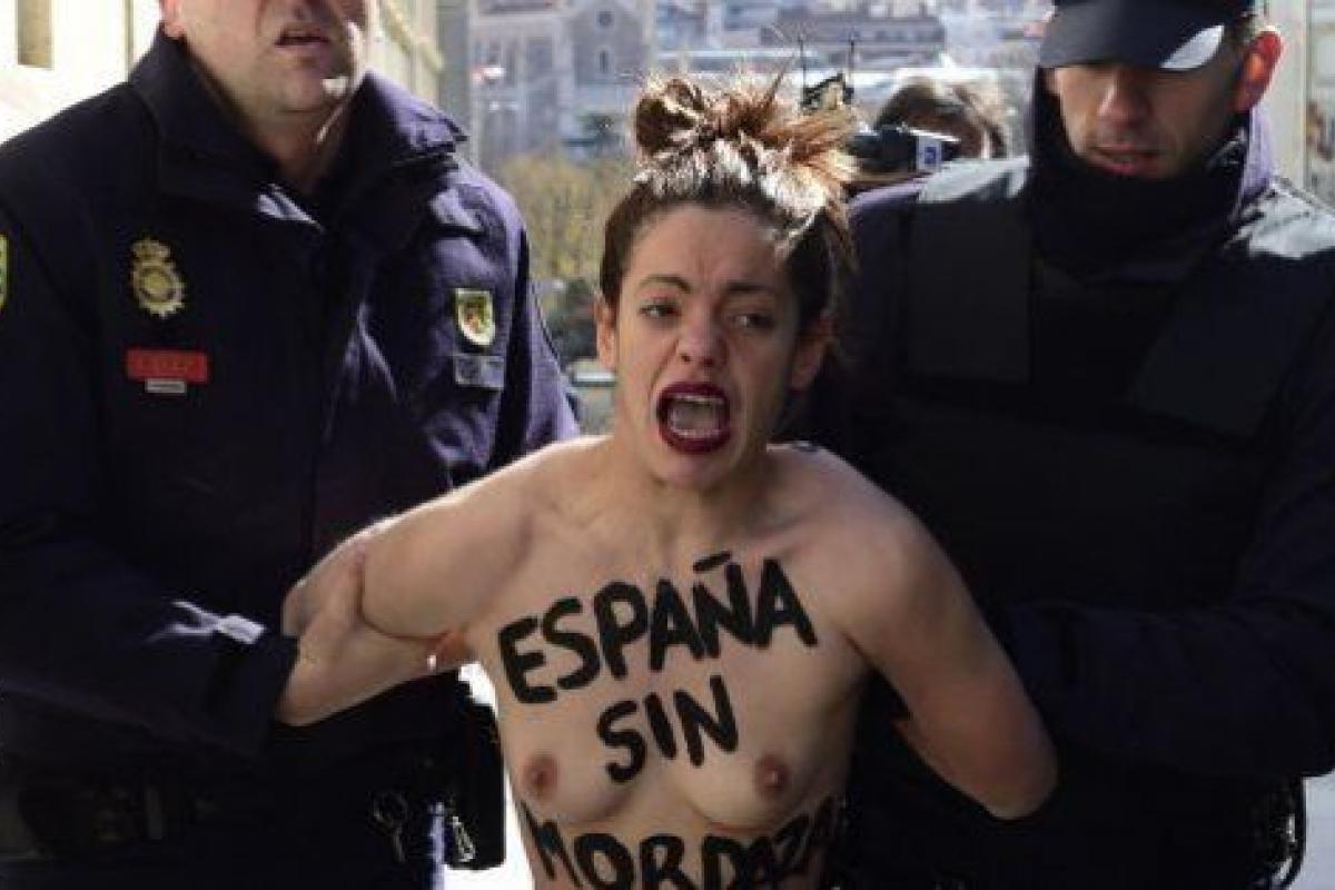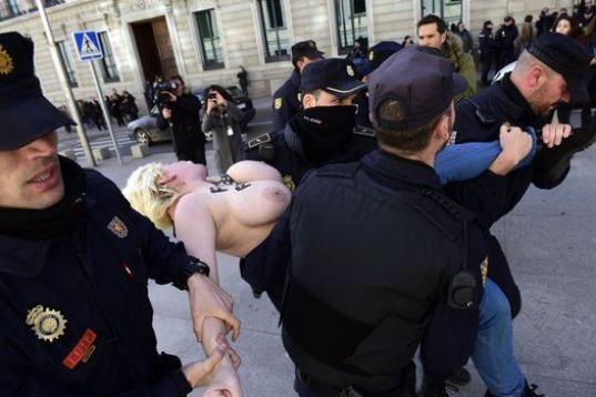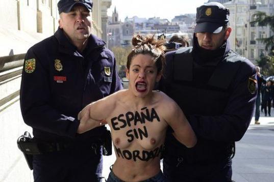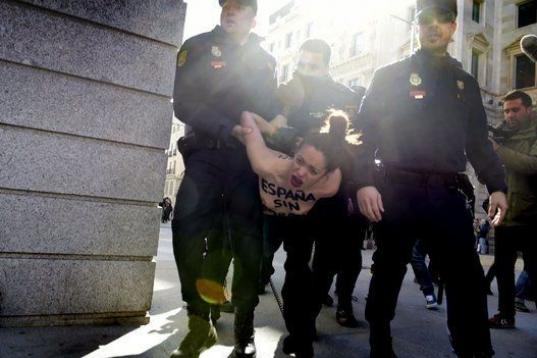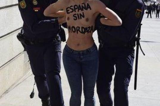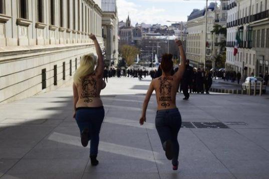 Varias activistas de Femen han protestado a pecho descubierto en los alrededores del Congreso de los Diputados en señal de protesta contra la Ley de Seguridad Ciudadana, coincidiendo con el inicio del Debate del Estado de la Nación.