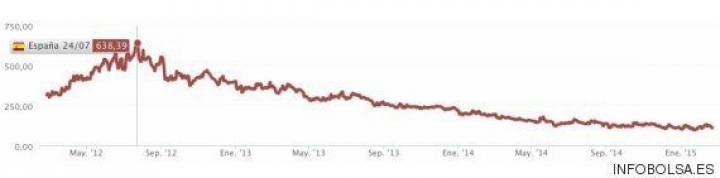 Es cierto que la prima de riesgo ha caído desde 2012. Es este gráfico de infobolsa.es se puede observar su evolución.