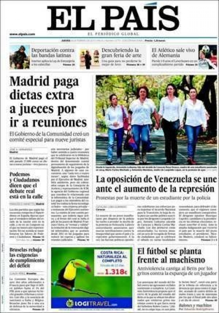 "La oposición de Venezuela se une ante el aumento de la represión" señala en primera El País bajo una foto en la que se encarna esa unidad en cuatro mujeres que acuden a la protesta por la muerte de un estudiante por la policía: la hija del alcalde Caracas, recientemente detenido; la madre de una estudiante asesinada en 2014, una de las líderes de la oposición y la madre de otro opositor detenido, Leopoldo López. En una tribuna, Julio María Sanguineti, expresidente de Uruguay, denuncia "un estentóreo silencio" de los gobiernos latinoamericanos que conocen bien la situación de Venezuela pero aprueban o callan.