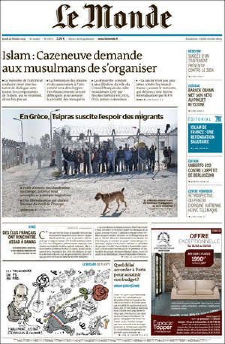 El ministro francés del Interior "pide a los musulmanes que se organicen" titula en primera Le Monde, que en un editorial "pide una refundación saludable" de esta religión que profesa unos 4 millones de personas en Francia. El ejecutivo que dirige Hollande ha creado un "órgano de diálogo" entre el Estado y los representantes musulmanes a los que exige una única voz. Austria ya se ha adelantado con la primera ley que busca "europeizar" el islam, como señala el Times de Londres. La norma prohíbe la financiación extranjera para la formación de imanes y la construcción de mezquitas. En Alemania, el conservador Frankfurter Allgemeine estima que es el camino a seguir para evitar que los imanes vengan de Turquía o que los saudíes financien el terrorismo.