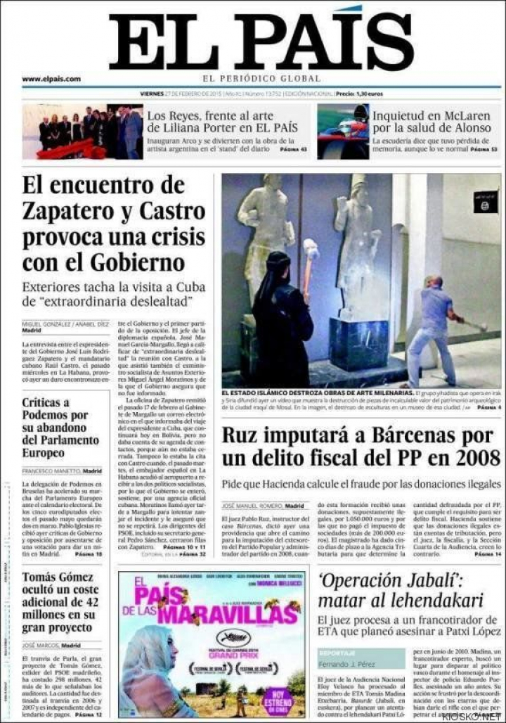 "Ruz imputará a Bárcenas por un delito fiscal del PP en 2008" asegura en primera El País, que alberga en su interior un artículo de Jorge Trias Sagnier en el que precisa el papel jugado por el Presidente del Tribunal de Justicia de Madrid, José Vieira, en invalidar las escuchas en el caso Gürtel ordenadas por el juez Garzón y la posterior inhabilitación de éste. Vieira ha cobrado dietas de una empresa relacionada con la Consejería de Justicia de Madrid. Pero otro caso, el de las tarjetas black, reaparece, porque, leemos en ABC, "el fiscal abre la puerta a la prescripción del delito en el caso de las tarjetas B", al menos para los directivos de Caja Madrid que las utilizaron hace más de 10 años.