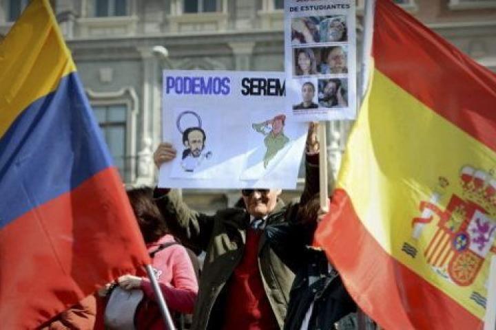 Unas quinientas personas han participado este domingo en la manifestación convocada por el Movimiento Español Venezolano AntiPodemos (MEVA), que ha cargado contra la ideología del partido liderado por Pablo Iglesias, al considerarla afín a la que actualmente gobierna en Venezuela.