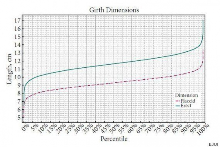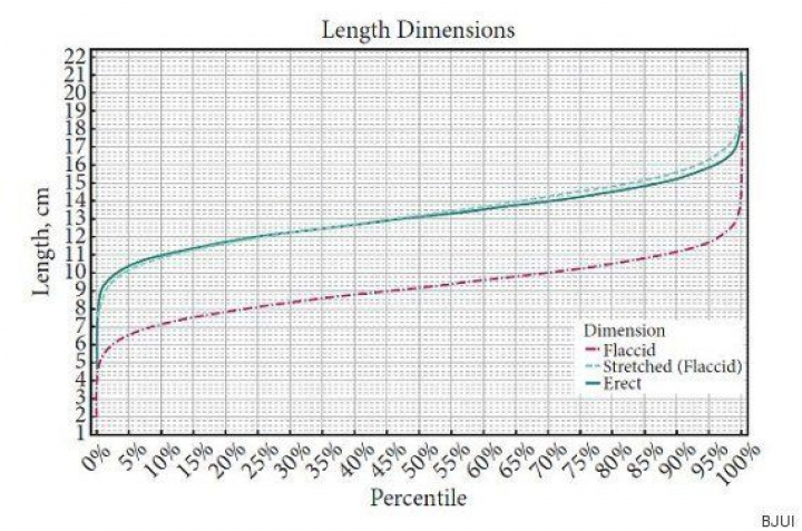 Ahora, el BJUI (la Asociación Británica de Urología) acaba de publicar un estudio realizado por el célebre King's College y el NHS (el Sistema Nacional de Salud) británicos. Ambas instituciones han analizado los penes de más de 15.000 hombres de todo el mundo, y han dado con la cifra: un pene erecto mide 13,12 centímetros de media, y su circunferencia es de unos 11,66 centímetros. En estado flácido la media es de 9,16 centímetros, mientras que su circunferencia es de 9,31 centímetros.