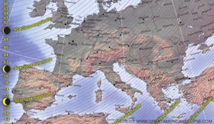 En Europa se reproducirá el mismo esquema que en España: cuanto más al norte se esté, el grado de intensidad será mayor. De hecho, los habitantes de las islas Feroe y las Svalbard, al norte de Noruega, podrán disfrutar de un eclipse total. Mientras, en ciudades como Oslo el oscurecimiento será del 90% y en París, de algo más del 80%. Así, cuanto más nos dirijamos al sureste, se notará menos. En Atenas, será del 0,40%.