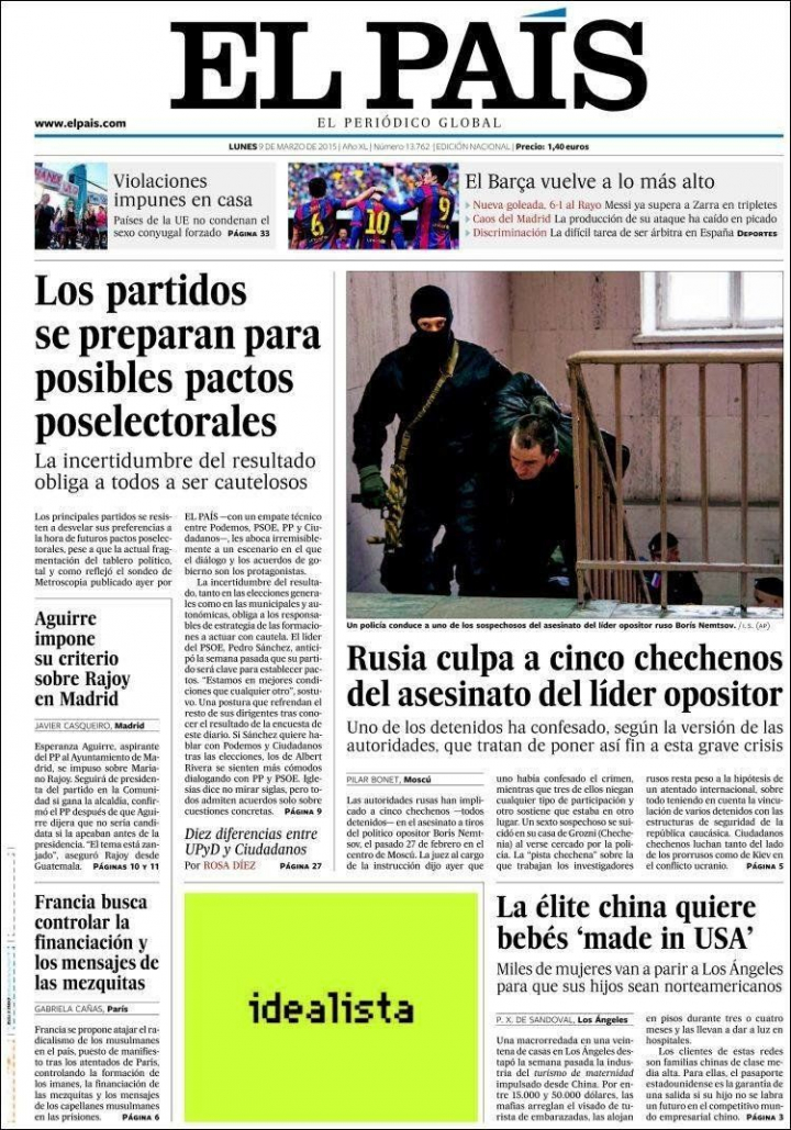 La primera la firma Esperanza Aguirre en El Mundo y en ella exige que los equipos que participen en esta competición respeten al monarca y al país... En la segunda, Joaquín Luna en La Vanguardia ironiza: "¡Qué país! Los que pitan el himno quieren jugar en la capital de España y el Real Madrid dice no... por España.. Allá van...