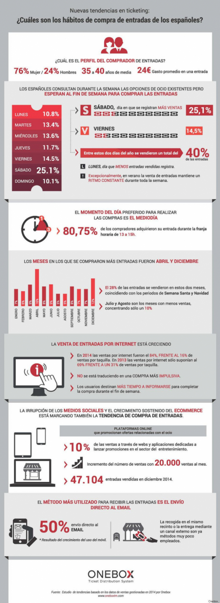 El negocio que gira entorno de la compra y venta de entrada mueve cada vez más dinero y, por eso, cada vez resulta más relevante saber los gustos y tendencias de los compradores. Onebox, compañía que desarrolla la tecnología para la gestión y venta de entradas de España, ha elaborado un estudio de tendencias basado en los datos de los tres millones de entradas gestionadas con su plataforma en 2014.