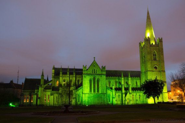 ... y acaba en la catedral de San Patricio, que en la imagen aparece iluminada de verde.