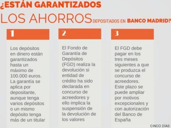 Solo están en riesgo aquellos que tengan más de 100.000 euros en el banco: los primeros 100.000 euros están avalados por el Fondo de Garantía de Depósitos, como ha recordado hoy el Banco de España. Si la entidad se vende o traspasa, el nuevo propietario de banco responderá por los pasivos, incluidas las cuentas. Si no hay posible venta, entonces Banco Madrid irá a liquidación (o resolución, como se dice en terminología bancaria): el FROB venderá los activos de banco y repartirá el dinero entre los distintos acreedores. En todo caso, la normativa europea que fijaba quitas para los acreedores no entra en vigor hasta 2016. En principio solo sufrirían quitas los titulares de deuda subordinada o deuda híbridos.