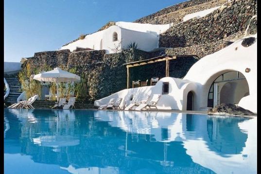 Necesitarás una barca para llegar a este complejo, situado en un mina del siglo XIX. Perivolas está en Santorini, Grecia.
