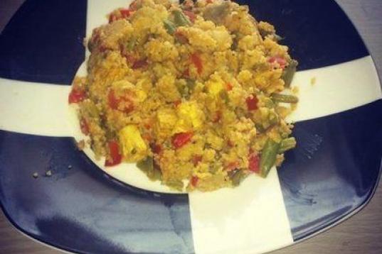 Lleva también arroz largo, judías verdes, cebolla y cebollino. En Cookpad puedes consultar la receta.