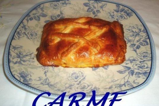 Sólo se necesitan sobras de pollo, masa de hojaldre y huevo para untar. La receta la puedes encontrar en Cookpad.