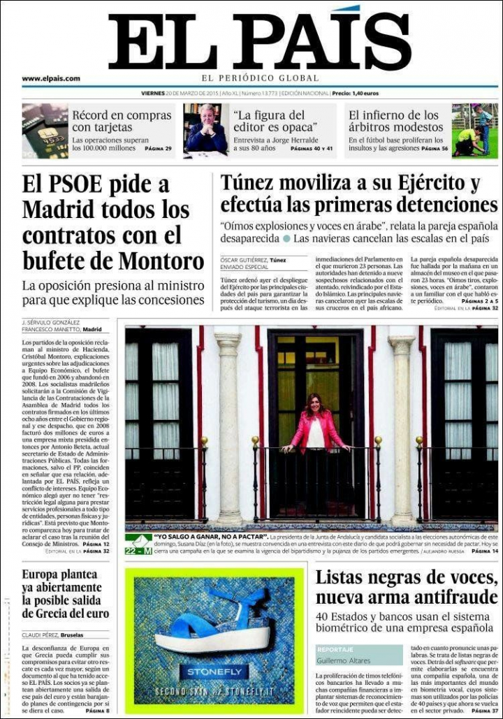"El PSOE pide a Madrid todos los contratos con el bufete de Montoro" es la apertura de El País, que señala que "los partidos de la oposición reclaman al ministro de Hacienda explicaciones urgentes sobre las adjudicaciones a Equipo Económico", que ayer alegó no tener "restricción legal alguna para prestar servicios profesionales a todo tipo de entidades, personas físicas y jurídicas".