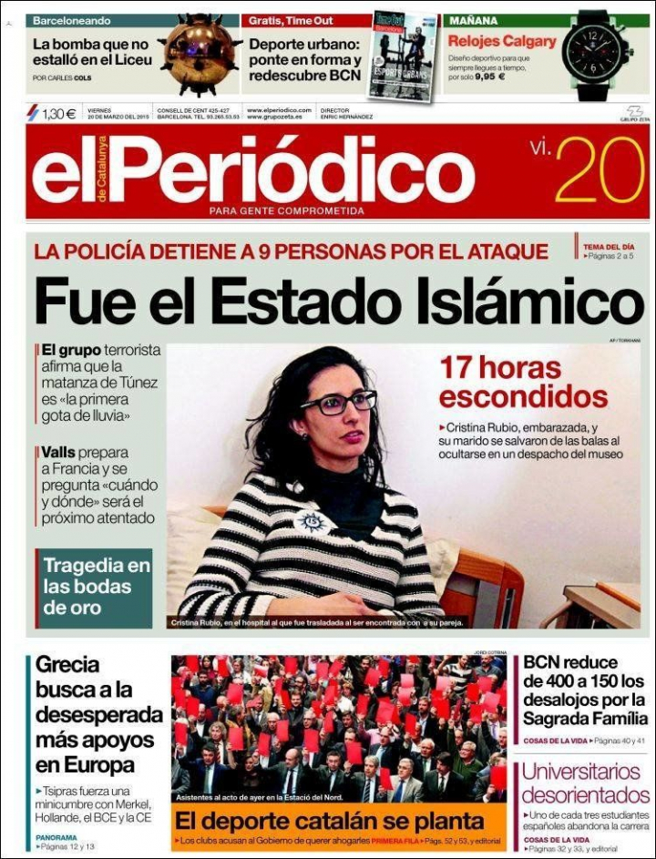 "Pensamos que íbamos a morir; oíamos tiros; lo hemos pasado fatal". Son las palabras de Cristina Rubio y Juan Carlos Sánchez, los dos españoles que sobrevivieron al ataque terrorista contra el Museo Nacional del Bardo tras permanecer 23 horas encerrados en un despacho. Su testimonio, que recogen El País y ABC, son las frases recogidas por los familiares. "Mi hija me telefoneó con voz temblorosa. Lo han pasado fatal. Pensábamos que iban a morir", cuenta el padre de Cristina, cuya imagen, una vez en el hospital al que acudieron para verificar el estado del bebé que esperan, ilustra la primera de El Periódico.