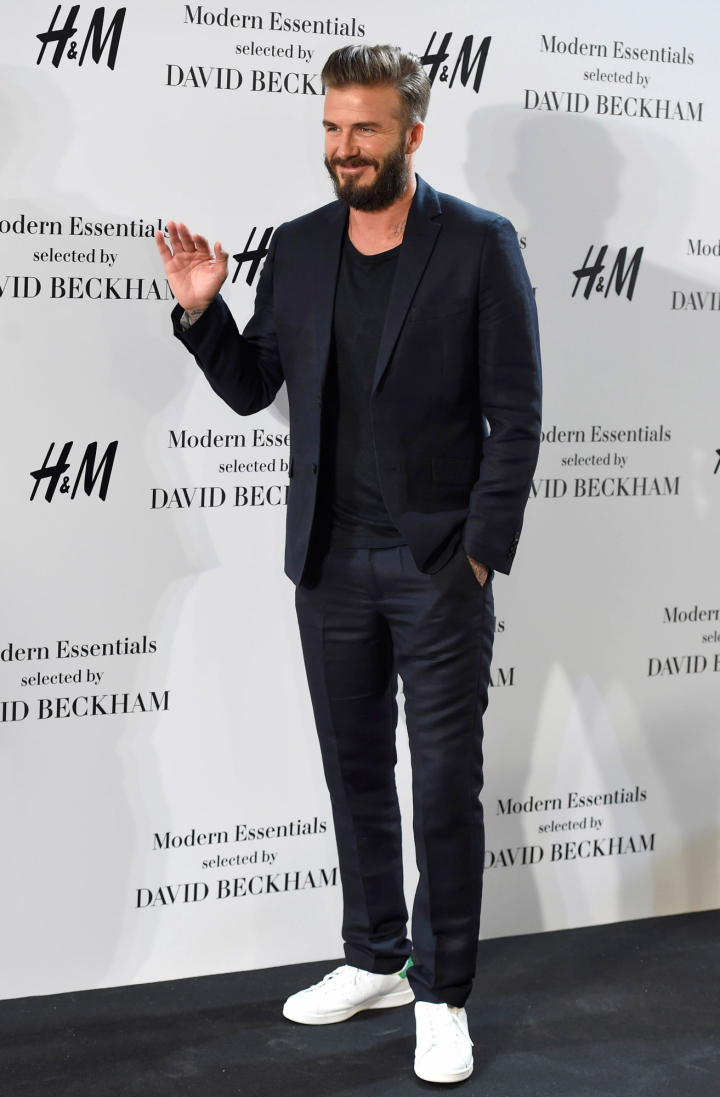 Se presenta sonriente, con un leve retraso y saludando a todo el mundo. Da la mano y escucha los nombres de los presentes con una sonrisa. Habla con calma, pausado, respondiendo con tiempo a cada interlocutor, mirando a los ojos. Con traje azul, camiseta negra y zapatillas blancas Adidas Stan Smith (las obligatorias de todo hipster del momento que se precie), como únicas joyas lleva su alianza dorada y una cadena casi oculta. David Beckham ha venido a Madrid a presentar su nueva línea para la firma de ropa H&M, y que ha bautizado como Modern Essentials Selection by David Beckham.