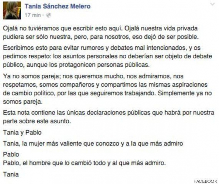 "Ya no somos pareja; nos queremos mucho, nos admiramos, nos respetamos, somos compañeros y compartimos las mismas aspiraciones de cambio político, por las que seguiremos trabajando. Simplemente ya no somos pareja", reza el mensaje que se ha compartido ya cientos de veces en las redes sociales.