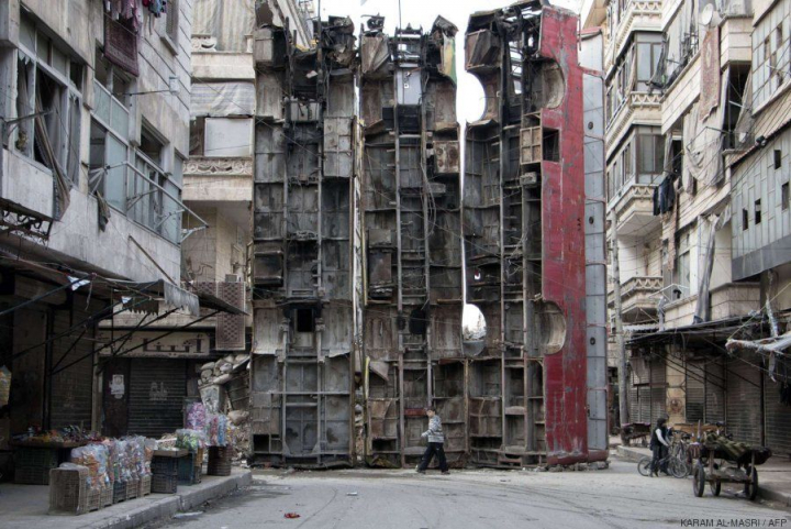 El conflicto de Siria, que ya suma cuatro años de dolor, lleva a los ciudadanos a usar el ingenio para sobrevivir. Por ejemplo, los vecinos del lado rebelde de Alepo, una de las ciudades centrales de la economía del país en tiempos de bonanza, han decido atravesar autobuses en vertical, a modo de escudo. Tratan de defenderse de los tiradores del Ejército leal al dictador Bashar el Asad, instalados en la calle de enfrente y que, según los Comités Locales de Coordinación -un grupo opositor que documenta los crímenes del Gobierno- han matado ya a más de 300 personas.