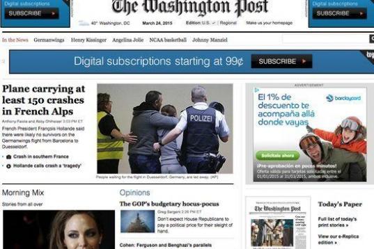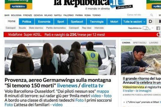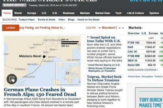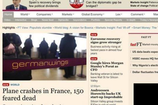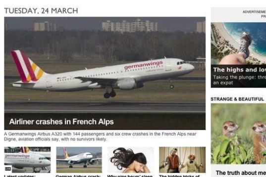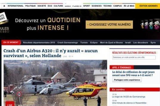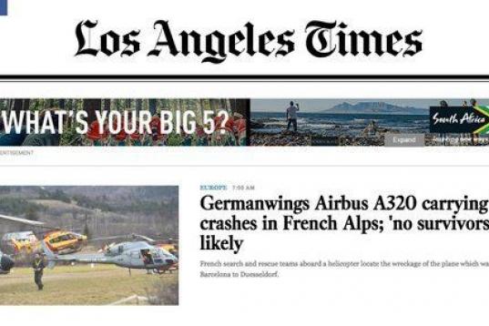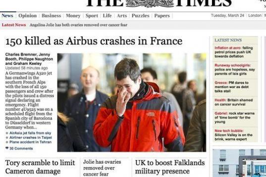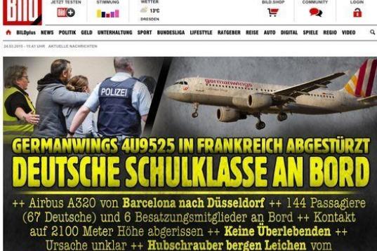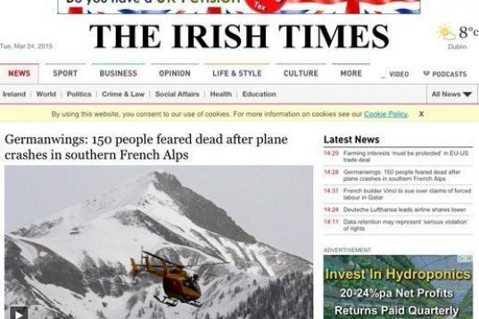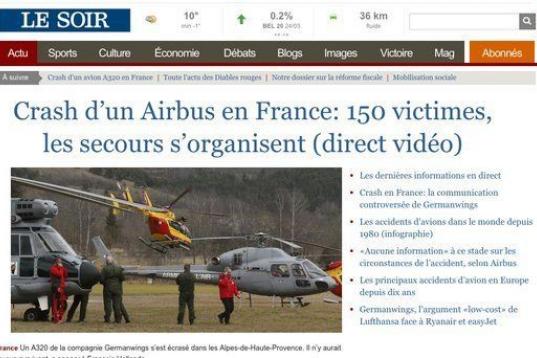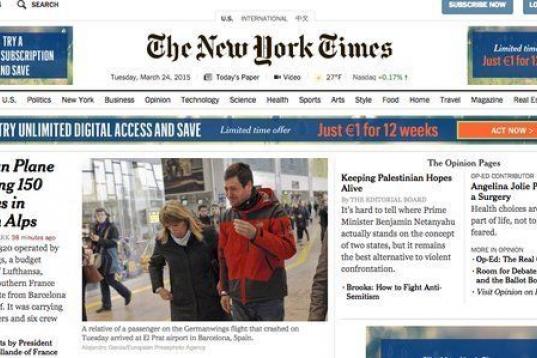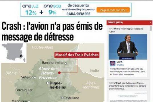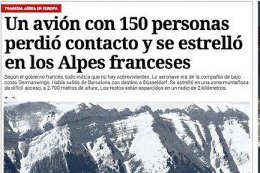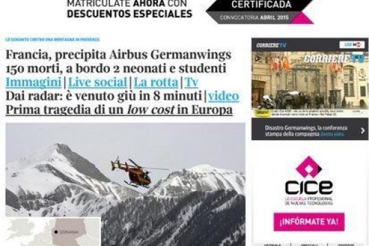 La noticia del accidente de un Airbus A320 de la aerolínea alemana Germanwings, que ha provocado 150 muertos -45 de nacionalidad española-, copa las portadas de los principales medios internacionales.