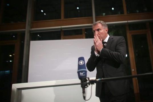 Un hombre que esperaba en el aeropuerto de Dusseldorf la llegada del vuelo 4U 9525 desaparecido se cubre la cara.