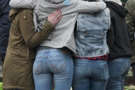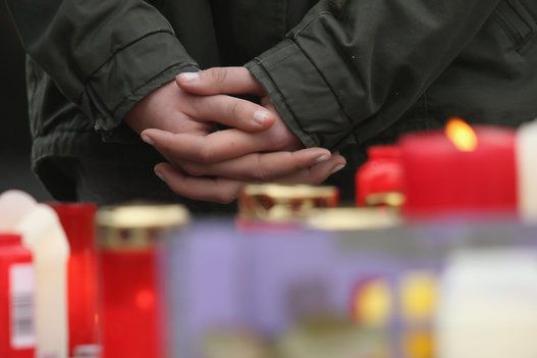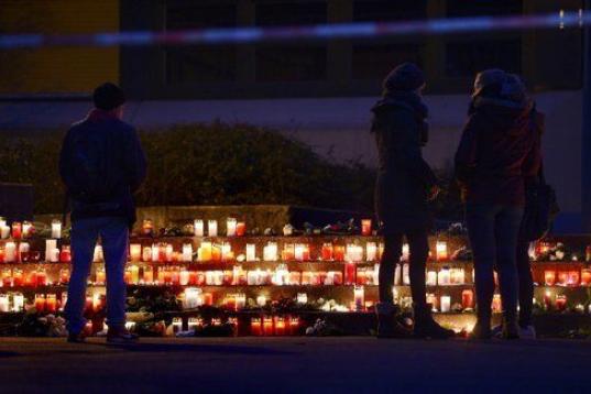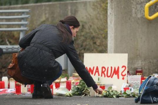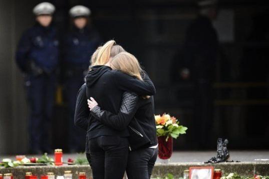 Compañeros de los 16 estudiantes alemanes se reúnen delante del instituto para rendirles homenaje