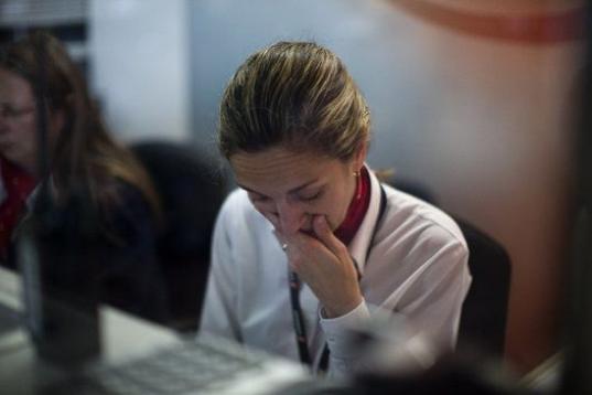 Una trabajadora de Swissport, una compañía de información y servicios que lleva Germanwings, reacciona en el aeropuerto de El Prat.